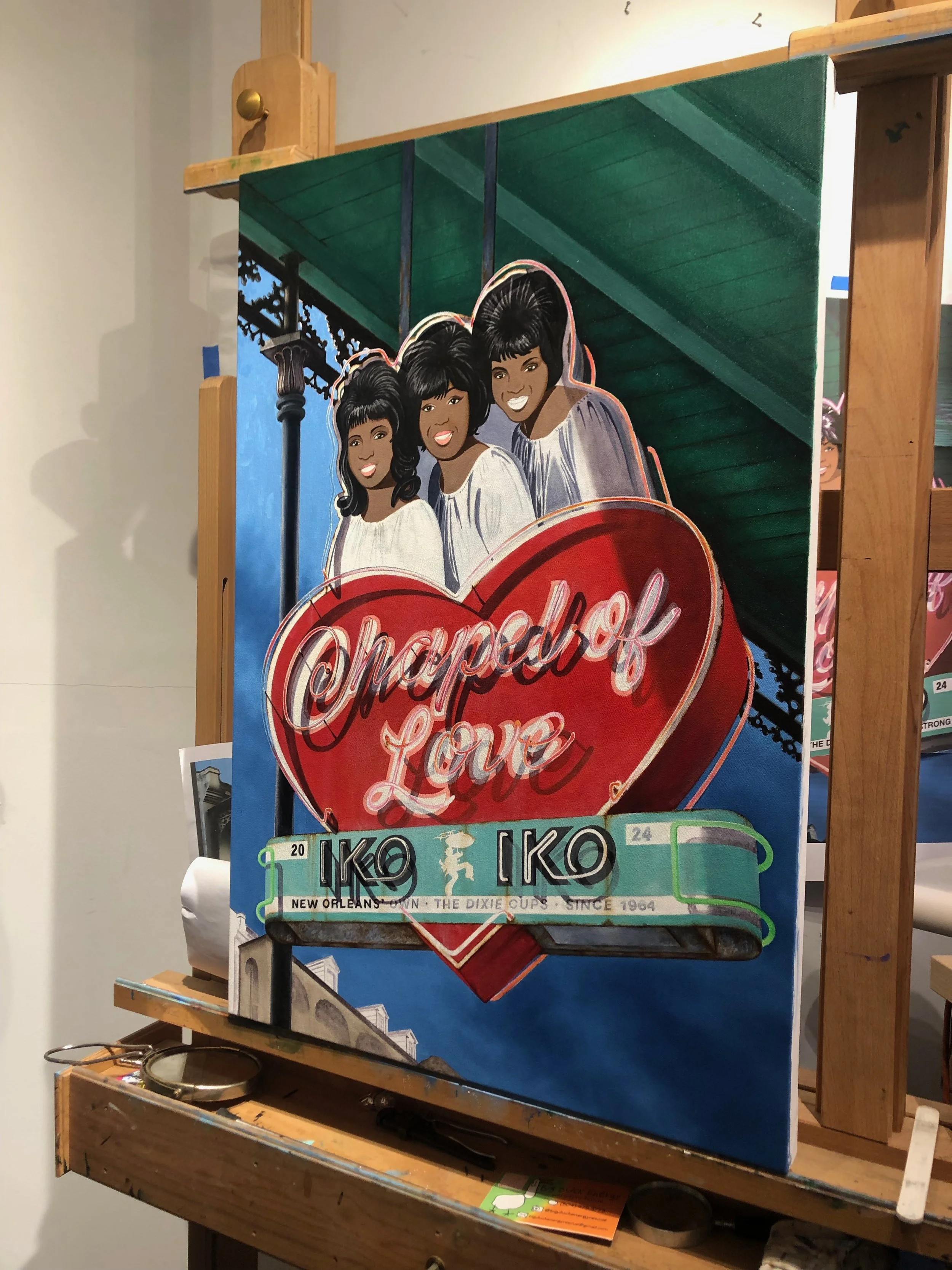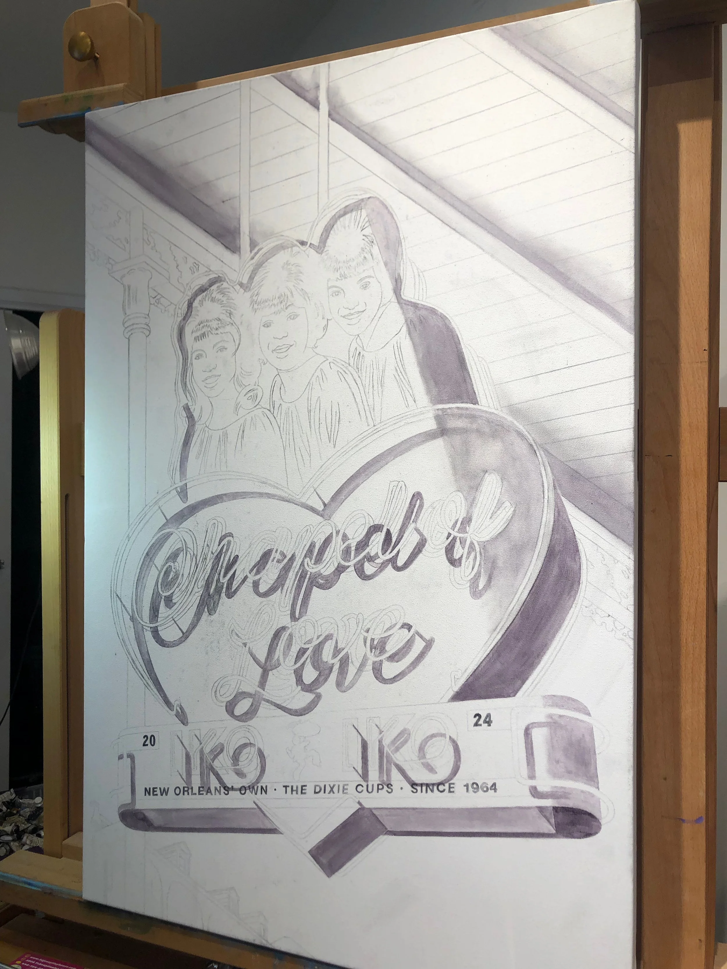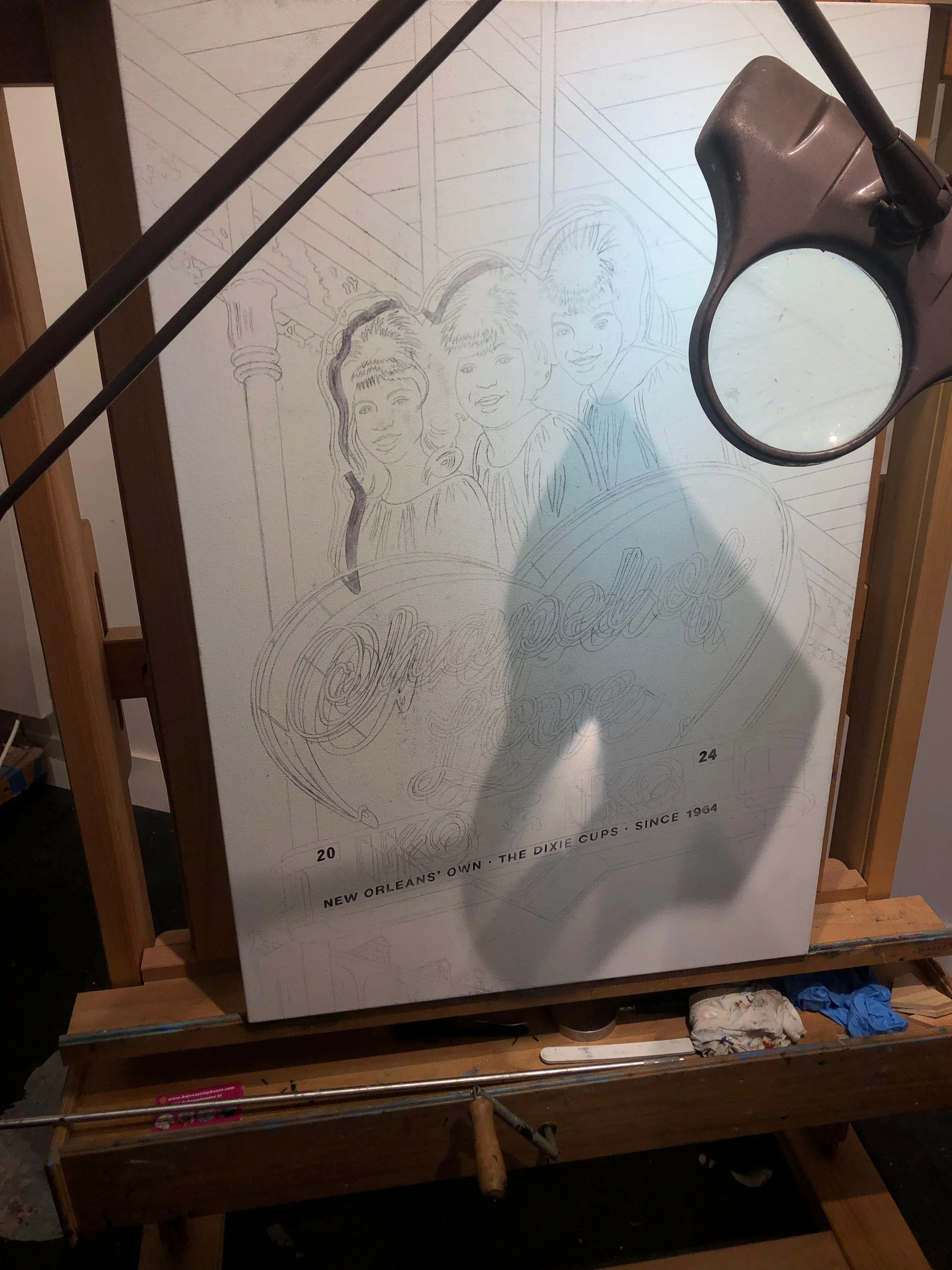 And when it came time to add the neon to the sign I wanted to keep it authentic, but not interfere with the faces of the Dixie Cups. Many actual neon signs that include people have detailed twists and turns over the faces that light up at night. But for this portrait, I only outlined their group image. I didn’t want anything obstructing their beautiful faces.