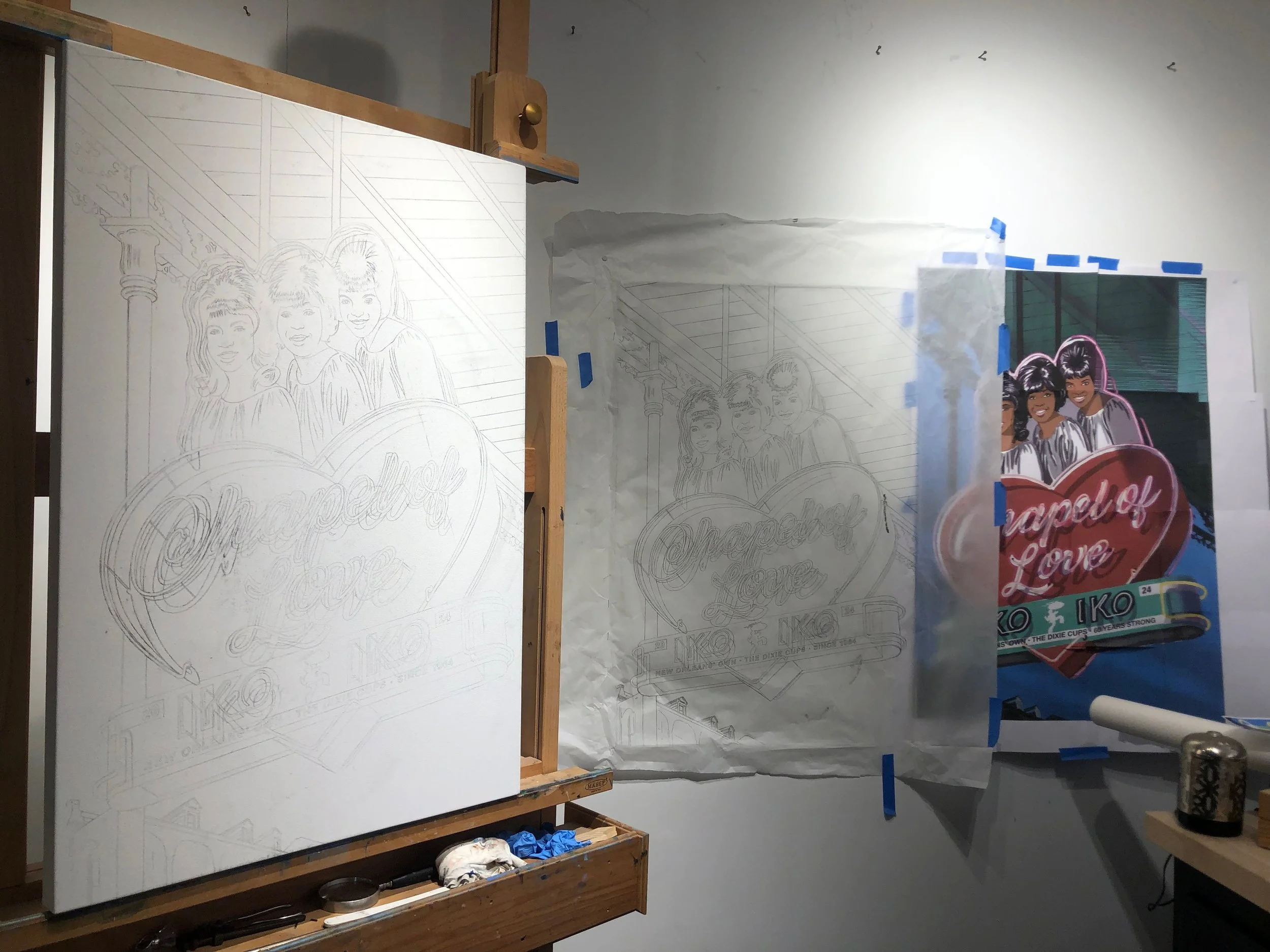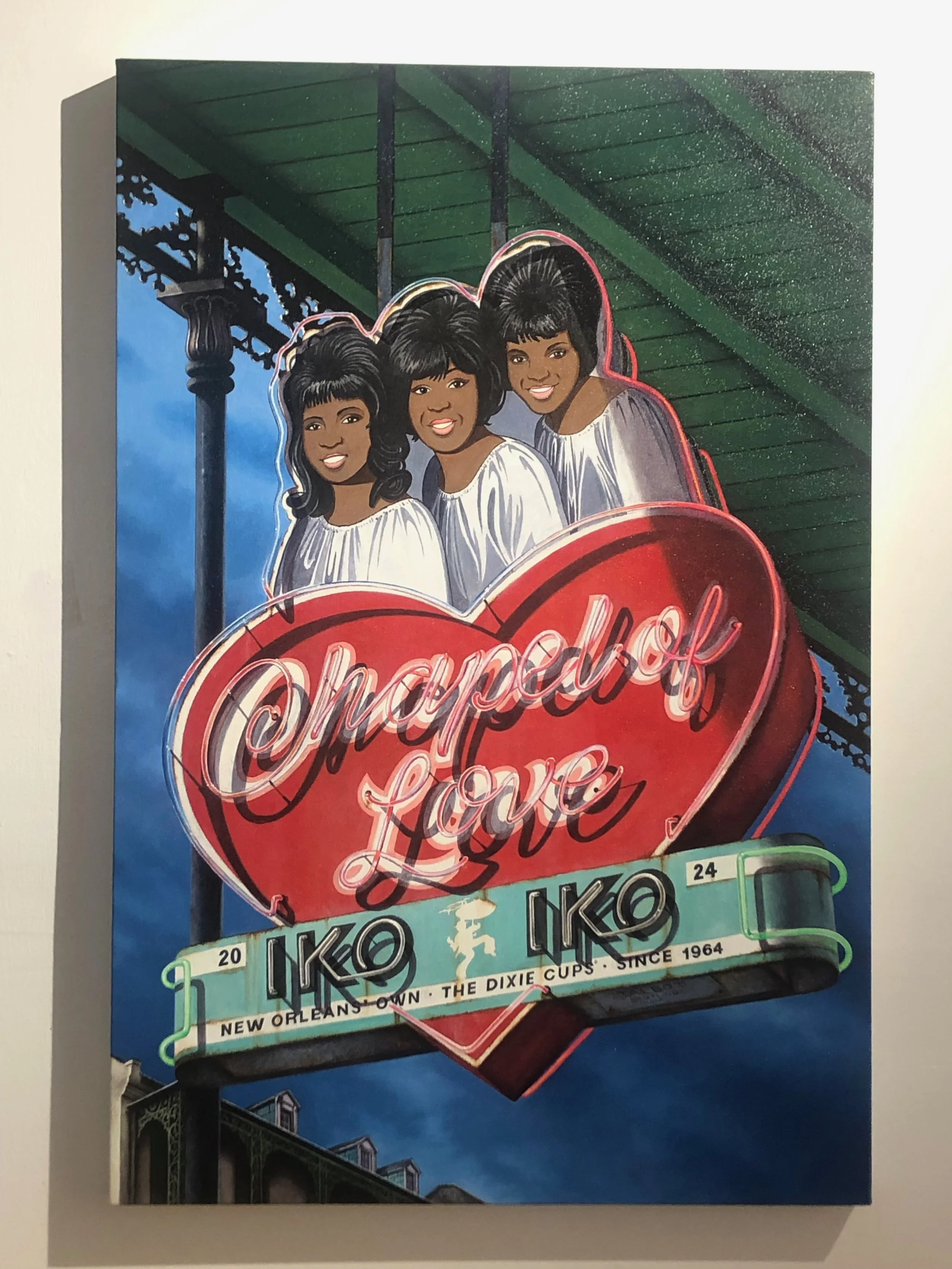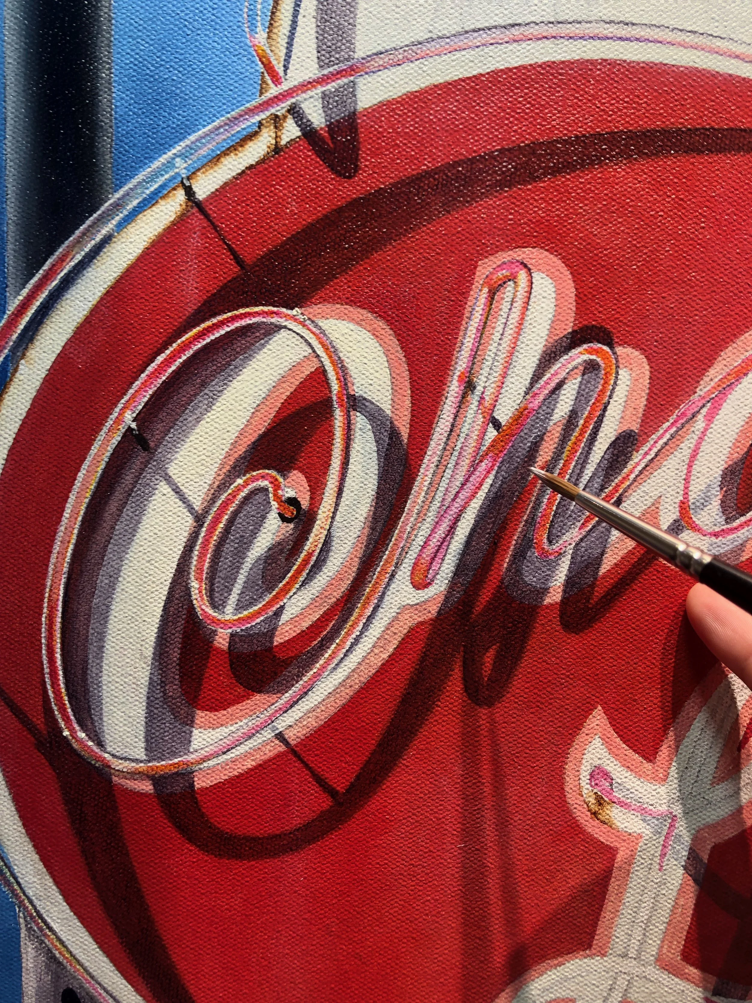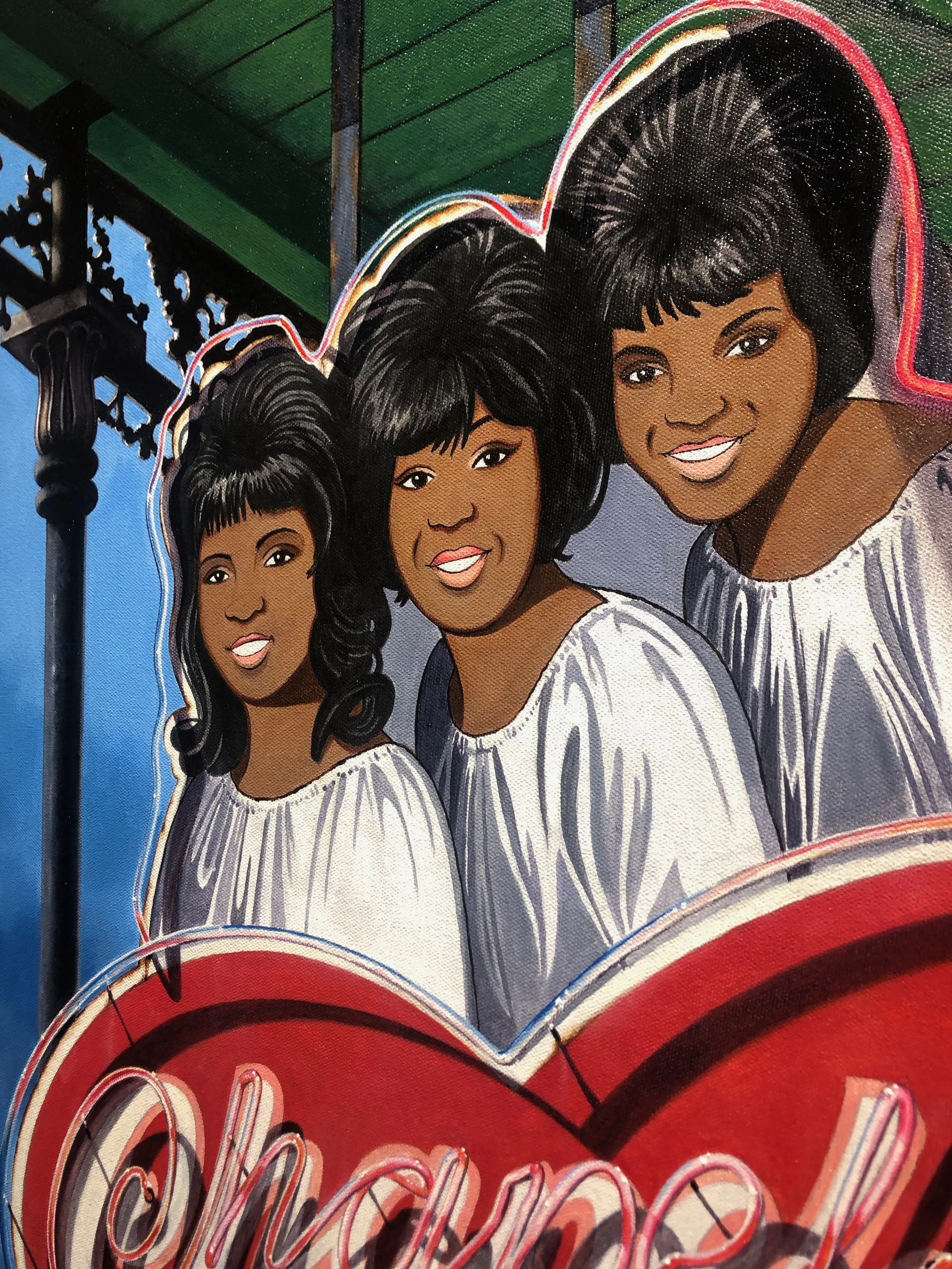 And when it came time to add the neon to the sign I wanted to keep it authentic, but not interfere with the faces of the Dixie Cups. Many actual neon signs that include people have detailed twists and turns over the faces that light up at night. But for this portrait, I only outlined their group image. I didn’t want anything obstructing their beautiful faces.